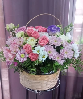Шарм - настоящее произведение цветочного искусства, сочетающее в себе изысканность и элегантность. Розы, символ любви и красоты, гармонично переплетаются с нежными хризантемами, символизирующими долговечность и верность. Эустома добавляет композиции нотку таинственности и загадочности, а альстромерия придает букету яркость и жизнерадостность. Каждый цветок в этой композиции - как отдельное произведение искусства, создающее удивительное впечатление. Плетеная корзинка дополняет образ, придавая ему натуральности и уюта. Композиция станет прекрасным подарком для особенного человека, которому вы хотите выразить свою искреннюю любовь и восхищение.