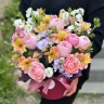 Шикарная композиция из роз и альстромерий, украшенных изысканной зеленью. Она наполняет пространство своим изысканным ароматом и величественной красотой цветов, которые отражают изысканный вкус его владелицы. Эта композиция яркая и нежная одновременно, она обещает стать неотъемлемым атрибутом особого момента в жизни и подарить незабываемые эмоции.